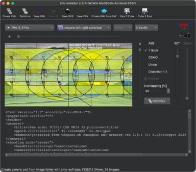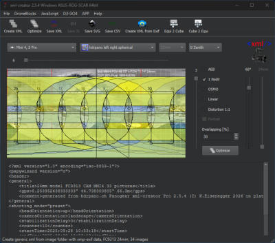 For my panoramas, I use an XML generator that calculates an optimal image overlap angle for drone panoramas. The gener-ated XML grid can be loaded into Autopano Giga, PTGui, and Hugin, and helps these applications achieve significantly better stitching results—especially in challenging areas such as water and blue sky with low texture.With this workflow, it is possible to create full 360° × 180° panoramas using drones. To complete the zenith area, it is necessary to capture an additional 2–5 zenith images from the ground after landing. The current version also includes an option to reduce lens distortion errors (see video below).The XML Creator can be downloaded from this page and is available for both Windows and macOS. It simulates the specific drone camera and the panorama software you intend to use.Currently supported drones and cameras include:Phantom 3 Pro, Phantom 4 Pro, Mavic Pro, Mavic 2 Pro, Mavic 2 Zoom, Mavic Mini, Spark, Inspire 1 and 2 (12 mm – 45 mm lenses), Mavic 3, Mavic 3 Enterprise, DJI Mini 3 Pro, DJI Mini 4 Pro, Air 2 / Air 3S, Mavic 4 Pro, and Mini 5 Pro.The current version reads XMP/EXIF metadata directly from the original JPG image files and automatically generates the corres-ponding XML file. This works with any shooting grid—simply select the folder containing the panorama images. Only original DJI files should be used, as the XMP/EXIF header may be removed by Adobe or other third-party applications. The drone model is detected automatically.DJI DNG files are supported. Please note that image files must first be fully synchronized from the cloud.If you would like to support my work, you can do so with a small donation.The following video explains the workflow in detail.